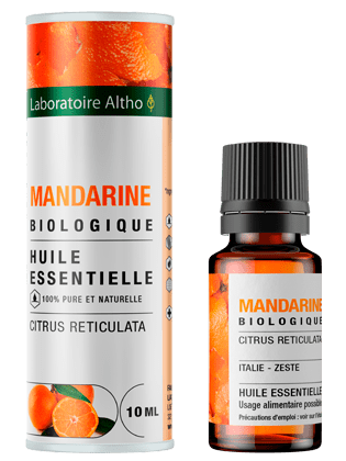 Huile essentielle de Mandarine bio ALTHO, obtenue par expression à froid des zestes du fruit.