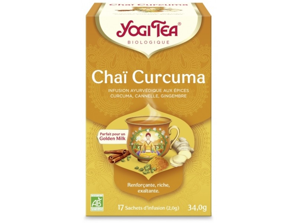Accompagné de réglisse et de cannelle, le curcuma fait voyager vers l’Inde où cette racine est un ingrédient précieux, au coeur de l’ayurvéda. Le chaï curcuma de Yogi Tea peut se préparer avec du lait chaud, on obtient alors un lait d’or, fameuse boisson reconnue pour son pouvoir anti-oxydant.