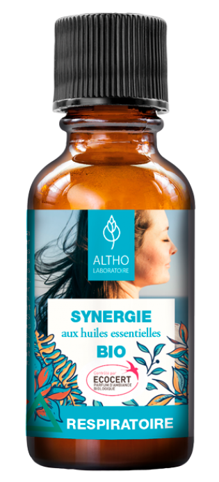 Synergie Respiratoire bio 30 mL, 10 huiles essentielles BIO spécialement sélectionnées pour leurs propriétés expectorante, anti-inflammatoire, antibactérienne et antivirale.