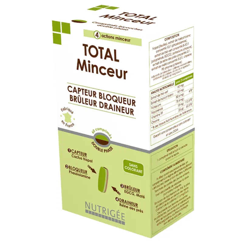 TOTAL Minceur de Nutrigée est un produit polyvalent conçu pour favoriser la perte de poids grâce à ses 4 actions minceur. Ce complément bénéficie d’un comprimé bicouche qui agit en deux phases distinctes pour des résultats optimaux.